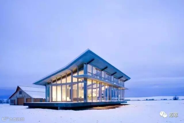 在高海拔高原的麦田中矗立着一间小玻璃屋和一座坚固的旧式谷仓。房屋主人受 Philip Johnson 玻璃屋的启发,希望在草原和高山间建立一座隐居之所。