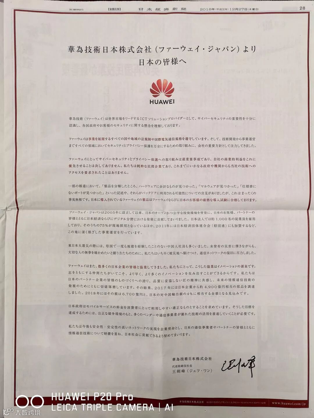 面对日本当局的态度,今天华为在日本发行量最大的财经类报刊《日本经济新闻》上发表声明摘要如下: