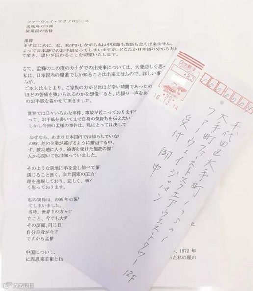 早在12月14日,日本一位自称是“一家小公司的小老板”为华为寄去了感谢信。信中他将孟晚舟称为“恩人”,因为“2011年东日本大地震时,其他公司都在撤退、逃离,华为却进入灾区抢修通信设施”。对于华为及孟晚舟的遭遇,他表示悲哀、难受又羞愧。