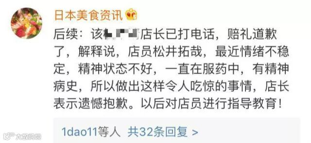 据说这家药妆店的店长后来打电话赔礼道歉了,解释说,订书精转世的店员松井拓哉,最近情绪不稳定,精神状态不好,一直在服药中,有精神病史,所以做出这样令人吃惊的事情,店长表示遗憾抱歉。以后对店员进行指导教育!
