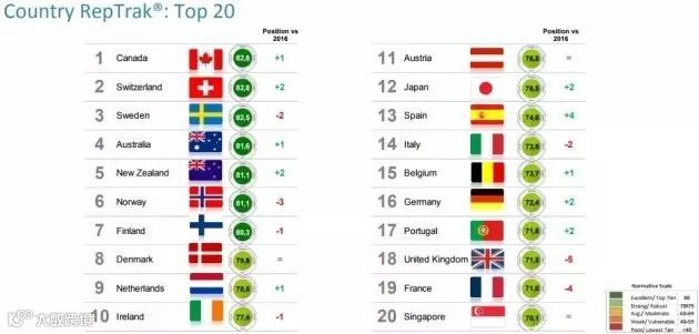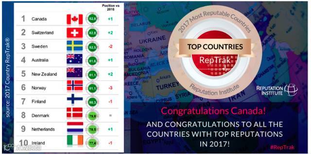 依据调查机构声誉研究所(Reputation Institute)公布的2017年度声誉报告( RepTrak)的报告显示,2016年排在第一名的瑞典退居第三,加拿大则由第二荣登榜首。