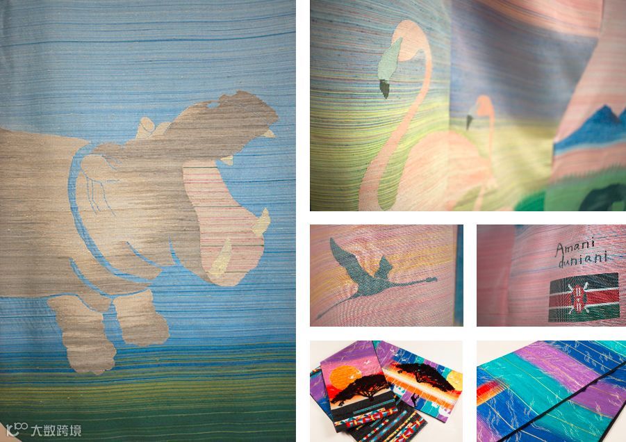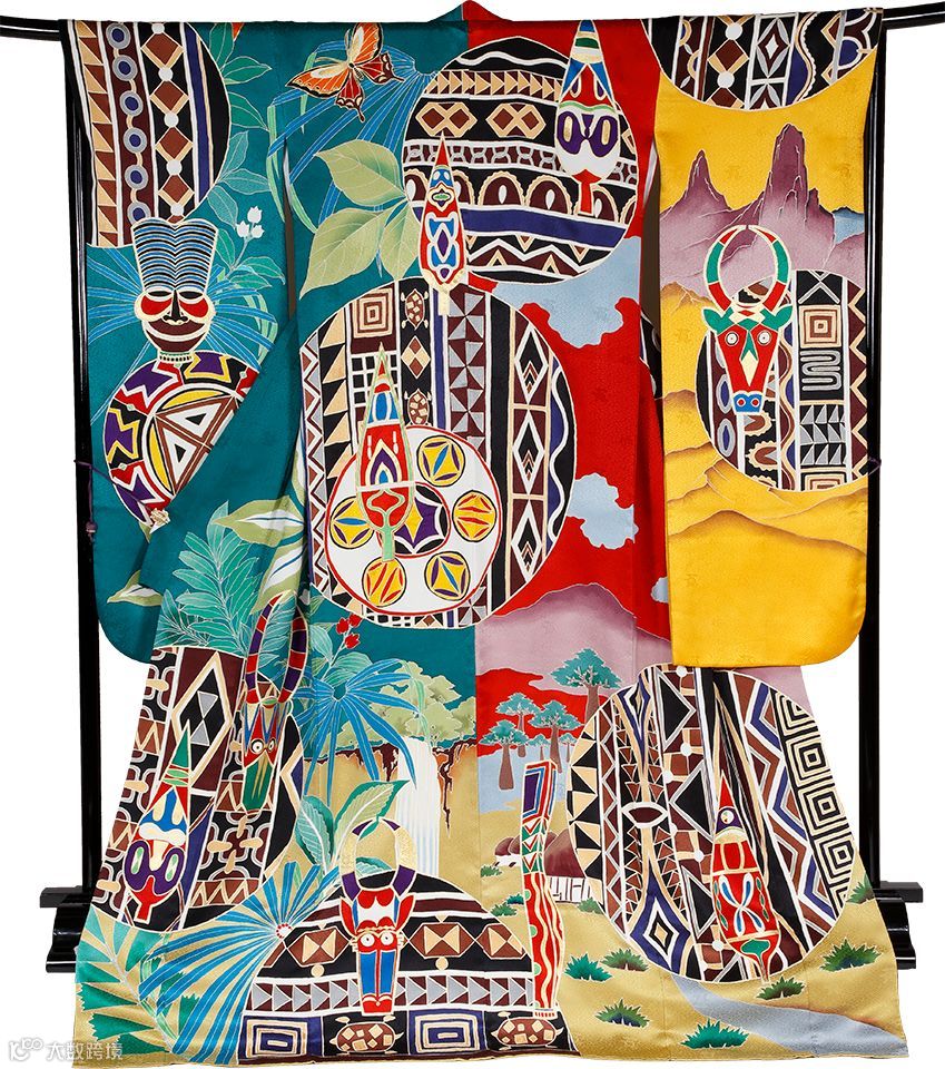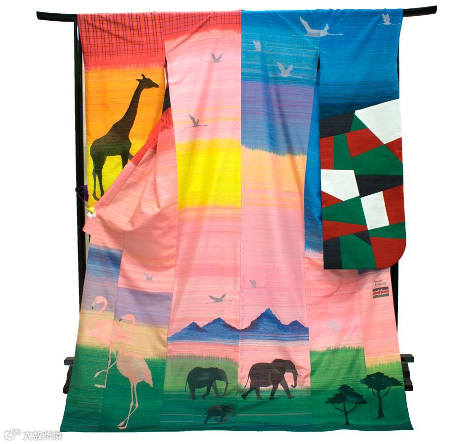 “野生动物王国”肯尼亚的和服使用了近200种颜色的线,织成广阔的自然和动物图案。