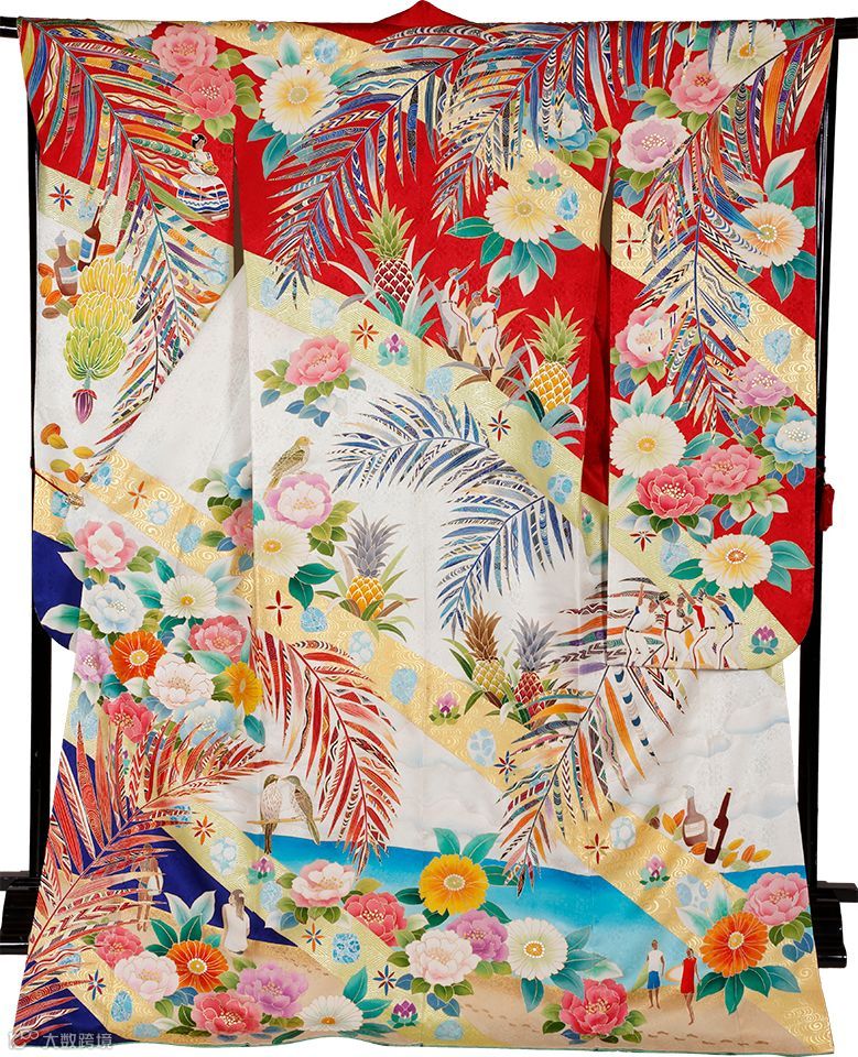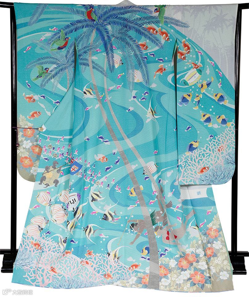 体现该国的和服图案为白色的环礁、闪耀的蔚蓝大海以及红、黄色的南国花朵。
