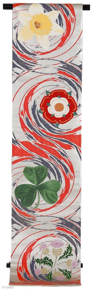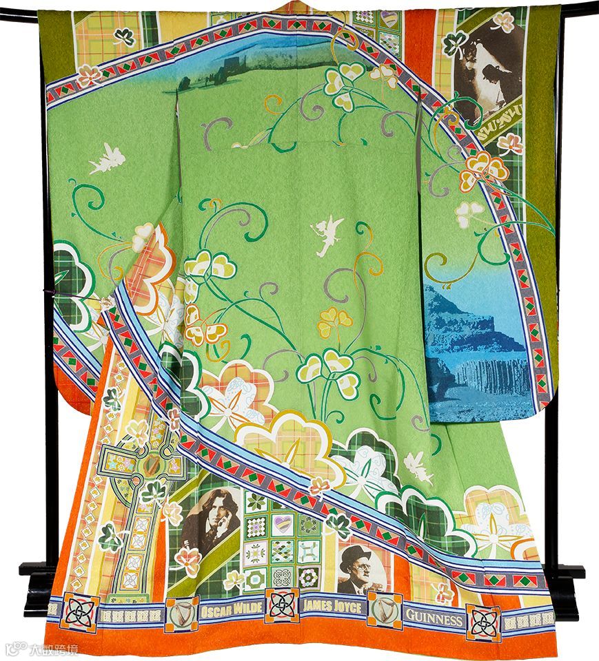 圣帕特瑞克十字、三叶草、爱尔兰代表性的伟人、世界遗产风景等,巧妙融合在这件和服上。