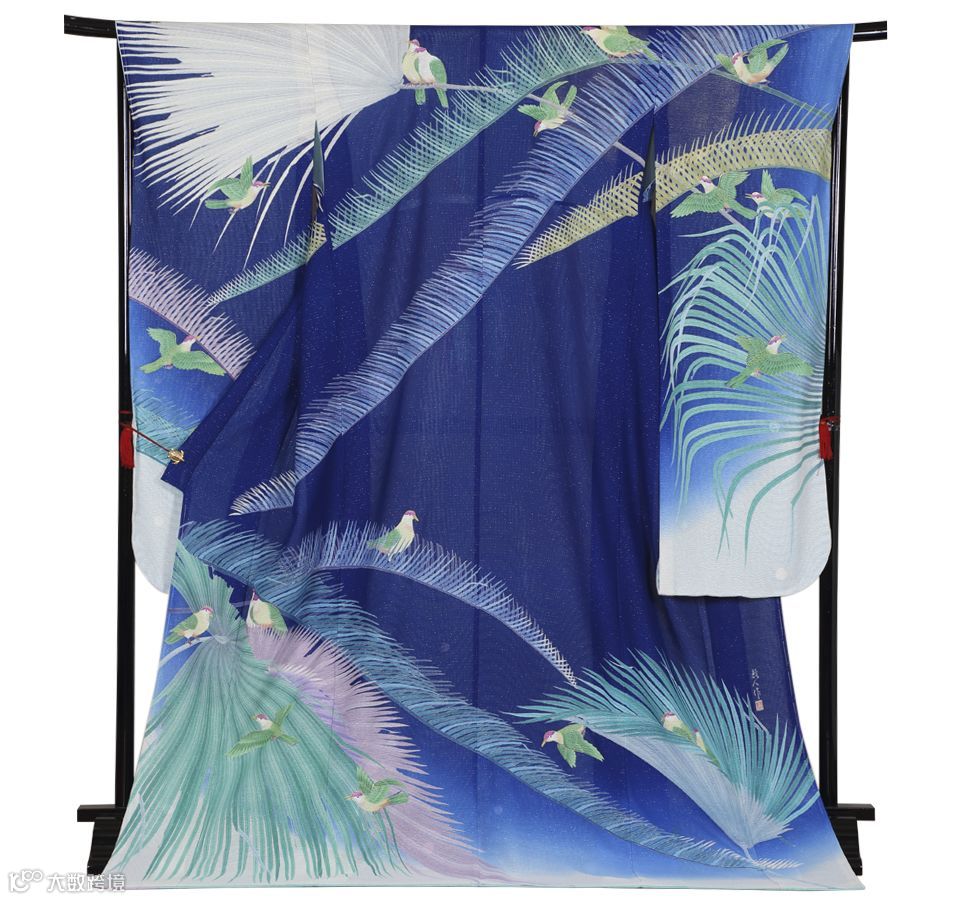 帕劳位于西太平洋,该和服以深蓝色为背景,描绘了鸟儿在南国植物林中飞行嬉戏。