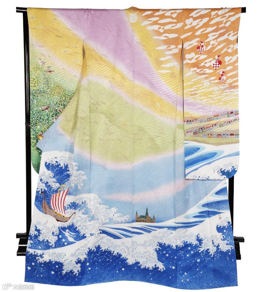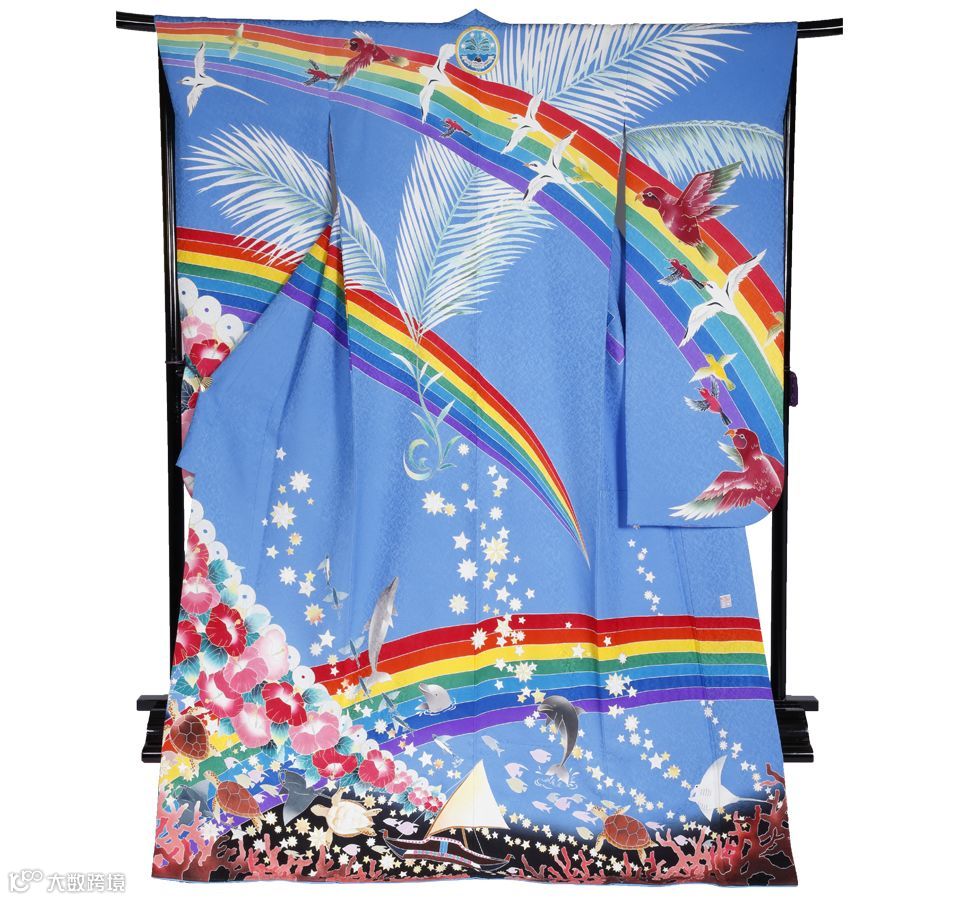 和服上大海与蓝天融为一体,彩虹划过处,