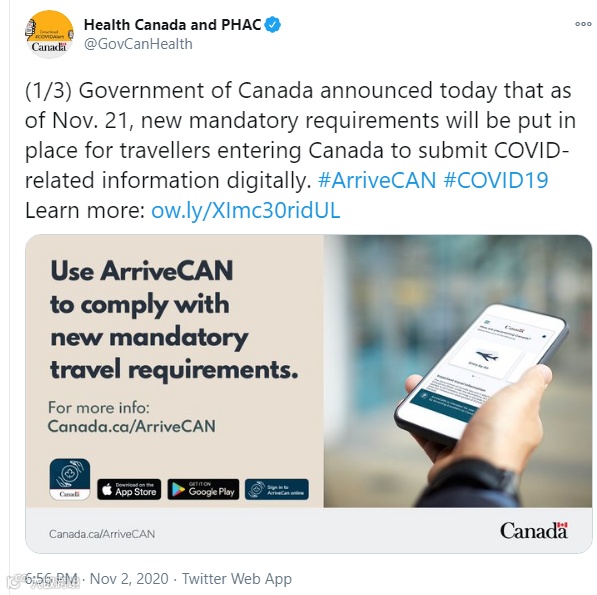 自2020年11月21日起,乘飞机前往加拿大的乘客必须在登机前通过ArriveCAN应用或网站提交个人电子信息,入境时出示 ArriveCAN 的回执,否则除由于个人情况(例如残疾或基础设施不足)的人外,将面临警告到1,000 加元不等的处罚。