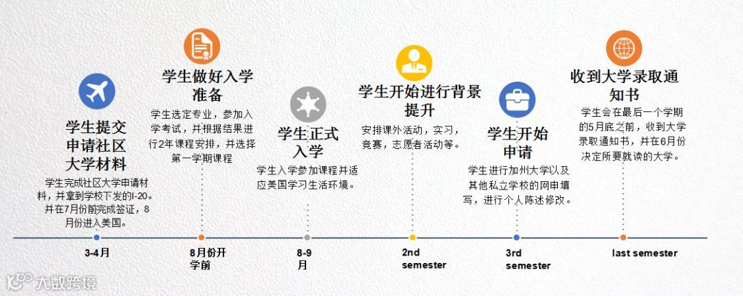 就读加州社区大学。两年的社区大学并不是国人所认为的大专,而是作为衔接四年制大学的有力平台和跳板。在社大就读的两年课程相当于四年制大学的一二年级课程。 学生在完成社区大学的一二年级,不仅可以转学到四年制的公立大学,例加州大学--UC系统。还可以迈入TOP美国私立大学:常青藤顶尖大学, 例如斯坦福大学,康奈尔大学,南加州大学等。继续三, 四年级的学习,毕业以后拿名校的学士学位 (bachelor’s degree)。