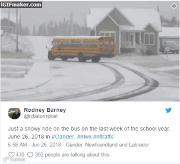 4.加拿大又下雪了!在多伦多迎来一波高温,体感温度达到 37 度同时,纽芬兰省今早从大雪中醒来,整个大地一片白茫茫,都快要放暑假了,校车却在雪地里滑行~