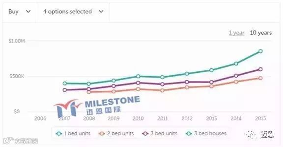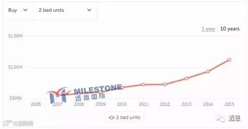 悉尼17km以内很难找到$50万的两房,悉尼两房公寓均价已过百万澳币,2016年超过百万的区已多于65个,还有20个逼近百万大关。