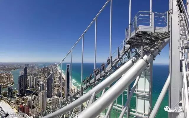 登高望远,想一览黄金海岸的繁华都市不局限于选择空中项目,在市中心的冲浪者天堂就可以体验。昆士兰第一高楼Q1的顶层外部提供攀爬,给你一览众楼小的视觉冲击。远看Q1的顶部倾斜高耸,着实让人有些望而却步。其实呢,Q1的SkyClimb是很安全的,上面设置有足够宽阔的攀爬楼梯,并且每一位上去的游客都会被安全绳索“五花大绑”,所以请放宽心,尽情享受高空中美丽的黄金海岸吧!