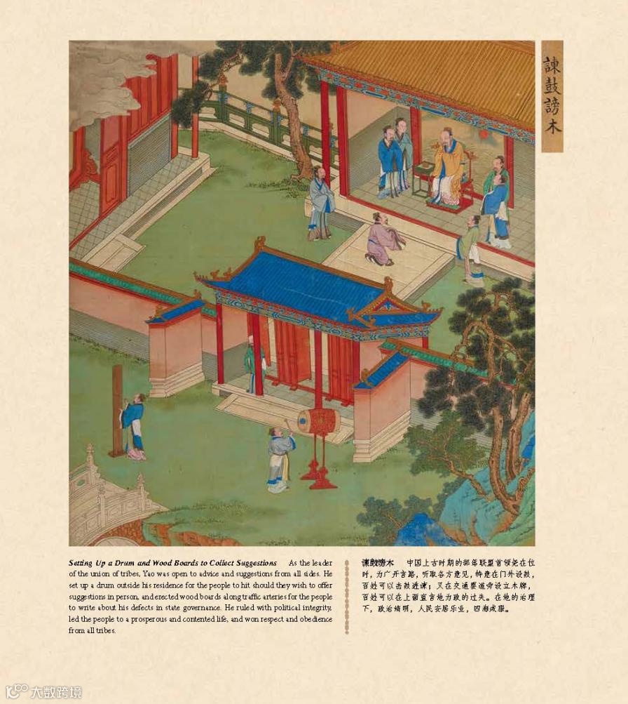 《帝鉴图说》初刊于万历元年(1573),所绘插画富丽堂皇,纤细入微。其故事背景横跨华夏历史,而画册中的建筑、车马、服饰等皆为典型的明代风格,通过亭台、庭院、树木、峰峦等景物的描摹,以景衬人,带有鲜明的中国画特色。