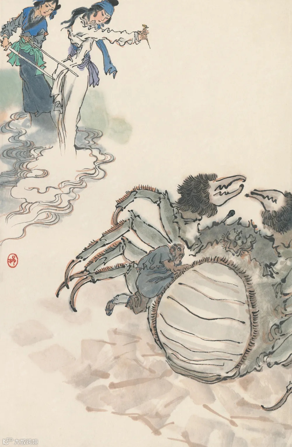西湖的水被白娘子施法吸干,法海逃无可逃,急忙钻进一个大螃蟹的肚子里。
