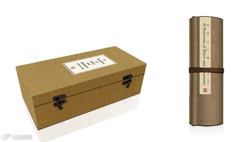 原作用一幅整绢绘制而成,纵51.5厘米,横1191.5厘米,是中国青绿山水的典范之作。本手卷采用了等比例缩放的形式,纵20厘米,画面横约462.7厘米,以丝绢印刷,背面托裱绫布。