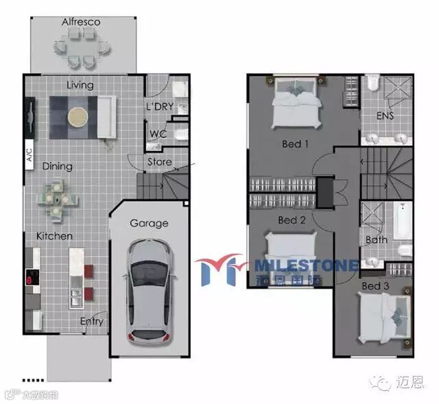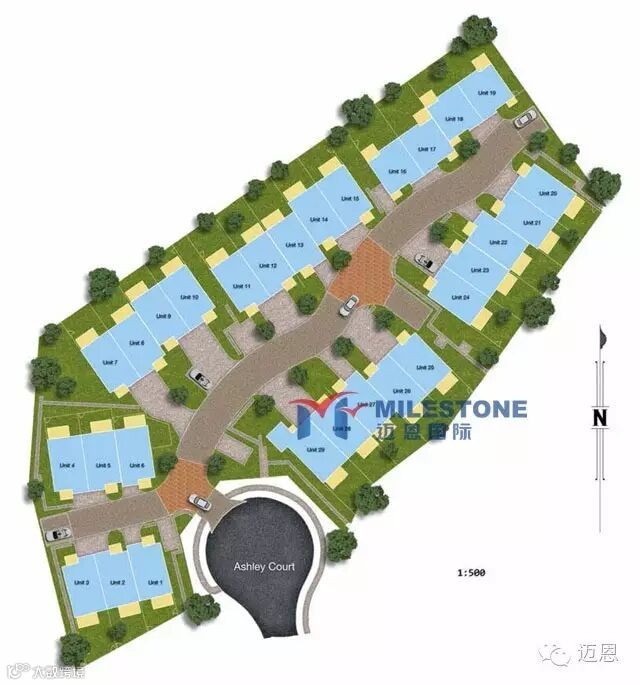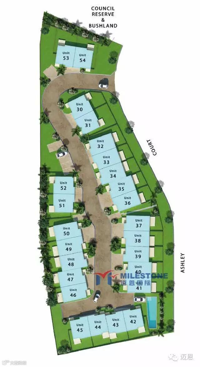 Ashley Park艾斯利公园雅居:每套联排别墅都有3间卧室,2间浴室,楼下1间卫生间,和遥控带锁车库,且带独立庭院。Ashley Park小区内有泳池,且背靠自然保护区公园和林地。