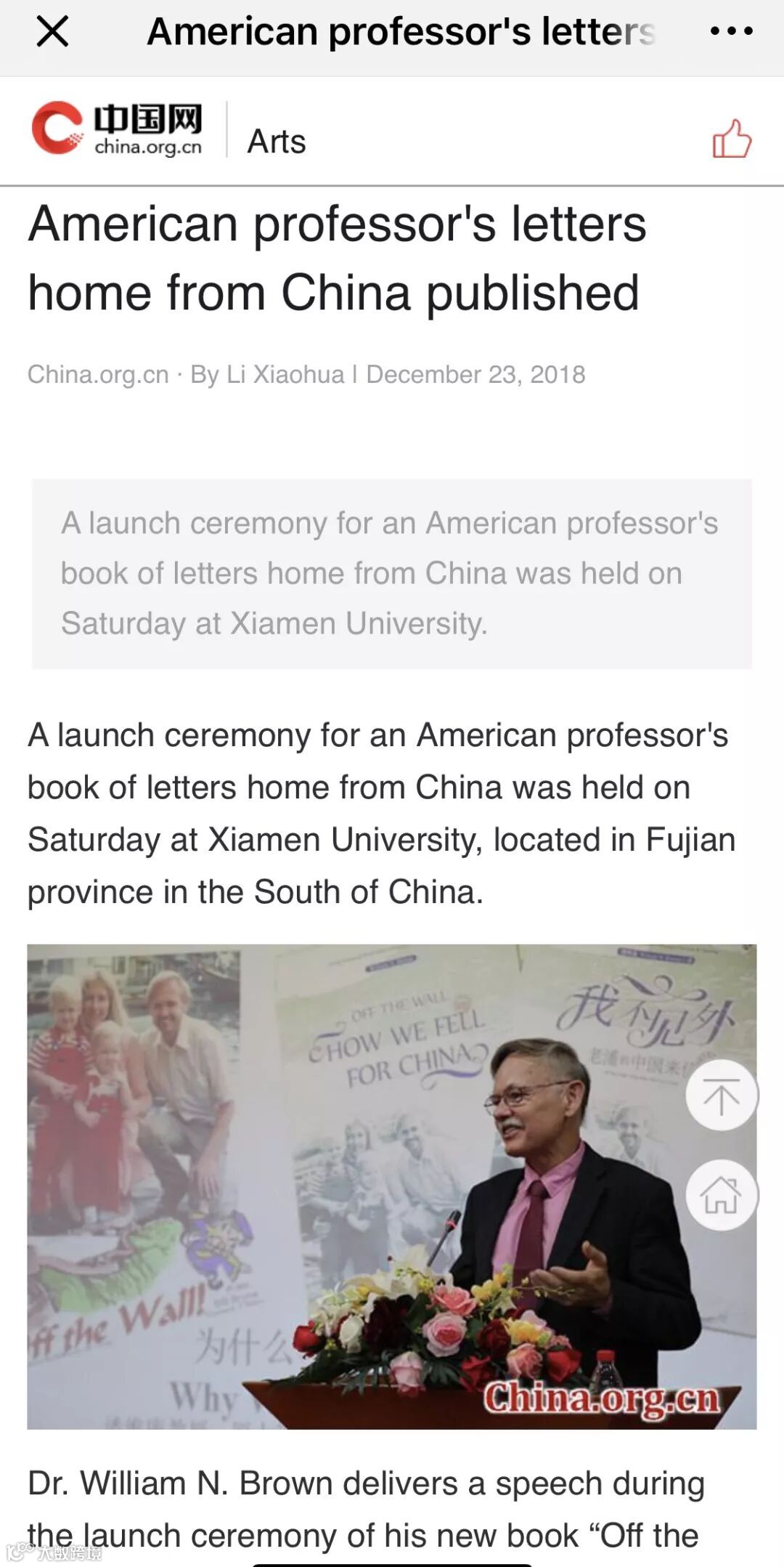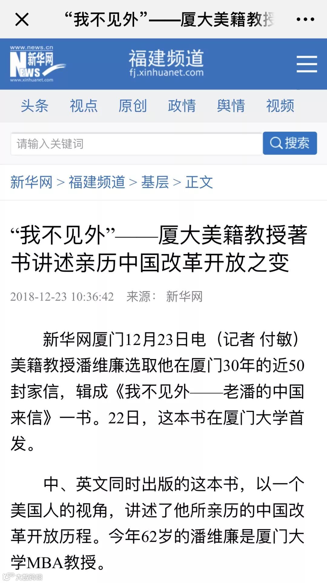 为纪念改革开放四十周年,在厦门大学学习、工作和生活了三十年的美国教师潘维廉(William N. Brown)教授的越洋家信,结集成《我不见外-老潘的中国来信》一书,近日由中国外文局所属外文出版社以中、英文出版。