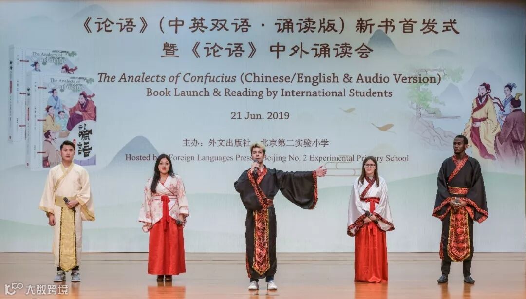 6月21日,由外文出版社出版的《论语》(中英双语·诵读版)新书首发式在北京举行,来自法国、墨西哥、刚果、印度尼西亚、克罗地亚的外国留学生代表与近百名小学生一起,用中英双语诵读《论语》经典名句,用一场别开生面的《论语》中外诵读会宣告国内首本汉英双语《论语》音频书正式面市。