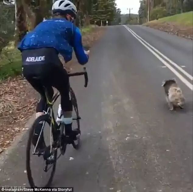 某天一个澳洲小哥去野外骑山地车运动,骑着骑着突然发现前方有个不知名的小动物在遛弯。
