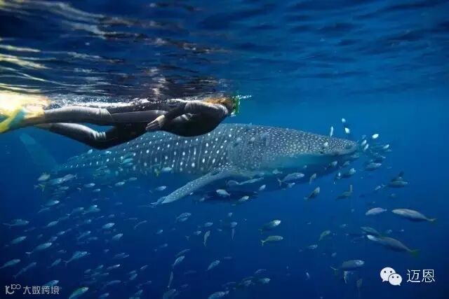 西澳大利亚宁加洛海洋公园(Ningaloo Marine Park) 附近的海岸可以说是地球距离迁徙的鲸鲨最近的海岸,它们每年3月-7月都会出现在这里。你只需要浮潜装备、面具和脚蹼,就能透过浮潜面具观察巨型鲸鲨那粗糙皮肤上的复杂图案、摇摆巨型尾巴的迷人身姿和如吸尘器一样的大嘴。不过别担心,鲸鲨是个素食主义者,对人类完全无害,所以你能放心的纵身跳入海中,和他们同游~