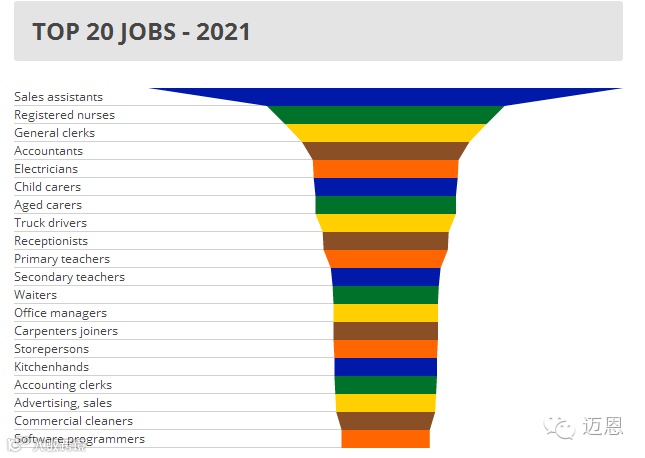除了这两种职业外,跻身就业人数TOP 5的还包括文员(262,400人)、会计(219,300)以及电工(191,600)。