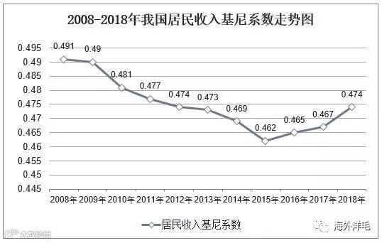 根据联合国开发计划署的统计数字,中国目前的基尼系数为0.45。占总人口20%的最贫困人口占收入或消费的份额只有4.7%,而占总人口20%的最富裕人口占收入或消费的份额高达50%。近几年来,我国的基尼指数波动不大,2018年我国基尼指数大约在0.474,都超过了警戒线,也就是说我国的贫富差距较大。