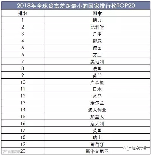 贫富差距问题一直是全球经济发展的难题,从2018年全球贫富差距最小的国家排行榜来看,全球贫富差距最小的国家是瑞典,其他欧洲发达水平国家的贫富差距也比较小,主要原因在于这些国家社会保障、福利高。日本是唯一一个进入前二十的亚洲国家,美国排名第23位。