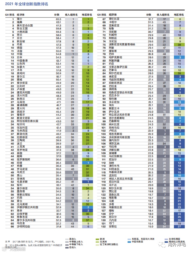 值得注意的是过去9年中,中国的GII排名稳步上升。2021年,中国的GII排名第12位,较去年上涨了2位,位列中等收入国家群体中第1位,也是中等收入国家群体中唯一一个排名进入全球前30的国家。