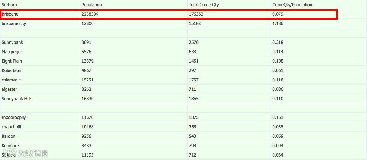 据昆士兰州警察局网站发布的布里斯班华人居住了南区及留学生居多的西区的犯罪率和人口数据,大家可以看到布里斯班的犯罪率平均值只有0.079。