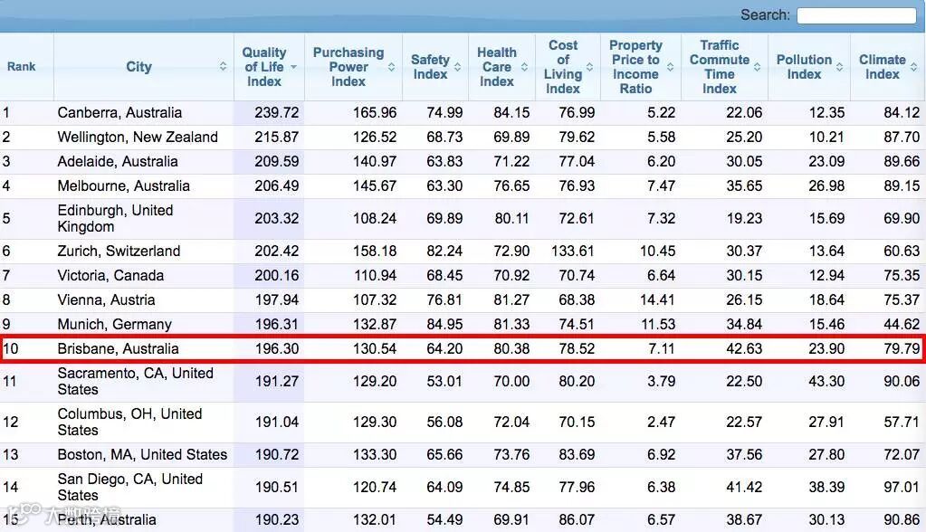 在Numbeo网站近期发布的“2016年生活质量最高的城市排名”中,布里斯班开启开挂模式,打败了排名仅在29名的悉尼,在全球城市排名中也是一路遥遥领先!