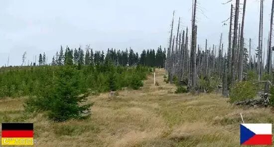 15、德国和捷克共和国的国境线,两国在面对虫害时表现截然不同,左边德国积极造林干预,右边捷克简直是破罐子破摔。