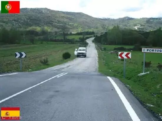 16、西班牙和葡萄牙的国境线,同一条马路,两块不同颜色的指路牌。