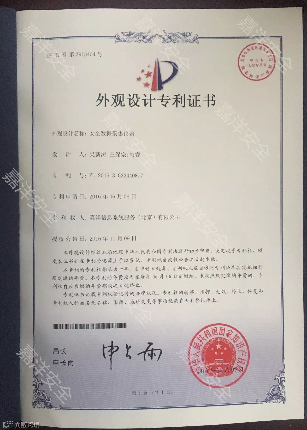 近日嘉洋智慧安全生产科技发展(北京)有限公司自主研发的安全数据采集仪器通过国家知识产权局的审核,荣获外观设计专利证书,且所提交的发明创造专利已被国家知识产权局受理申请。