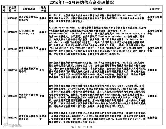 中石化公布了2016年1-2月的违约供应商名单,共涉及6家公司。其中四川省威尔敦化工有限公司、JC Fabrica de valvulas, s.a以及唐景自控设备有限公司因不诚信被取消供应商资格,上海福克斯波罗有限公司、郑州市少林滤材有限公司、湖南长重机器股份有限公司因服务、质量或者延迟交货问题被通报降级。