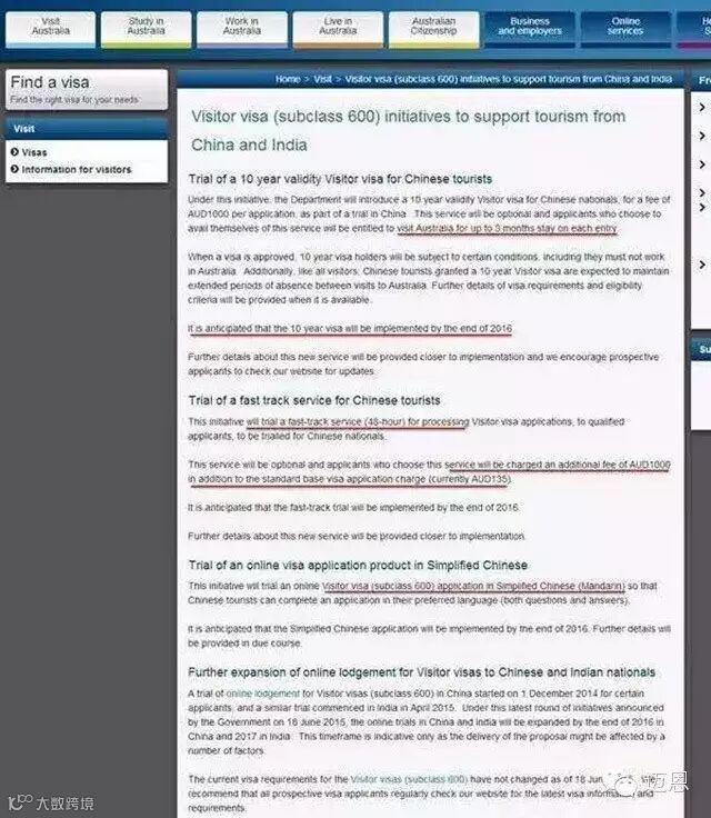 同时也请注意这个10年签证仅仅针对的是旅游签证类别,而不是商务考察。澳洲移民局针对中国护照持有人申请商务考察最长有效期为3年,并不是10年。