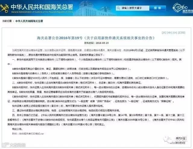 海关总署公告2016年第19号 《关于启用新快件通关系统相关事宜的公告》