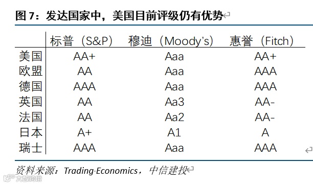 惠誉评级于8月1日将美国长期外币发行人违约评级(IDR)从“AAA”下调至“AA+”,“负面评级观察”调整为“稳定展望”。惠誉认为美国信用评级的下调反映了未来三年预期的财政恶化、高企且不断增长的一般政府债务负担,以及在过去20年里,相对于评级为“AA”和“AAA”的同类国家,美国的治理水平受到侵蚀,这体现在一再出现的债务上限僵局和最后关头的决议中。这是自2011年以来权威评级公司下调美国信用评级。2011年8月5日,世界三大评级公司之一标准普尔曾将美国长期主权信用评级从AAA下调至AA+。