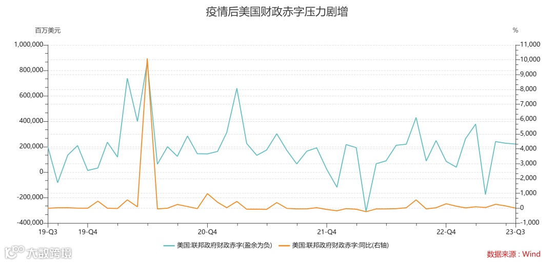 惠誉认为,低利率的环境已经过去,今后高利率可能成为常态,导致美国政府的债务利息负担急剧上升,债务可持续性的担忧加重。疫情过去后,美国扩张性财政的思路并未扭转,而税收却在回落,高支出下赤字未按预期收敛,反而持续抬升,美债供给的超预期增加削弱信誉。
