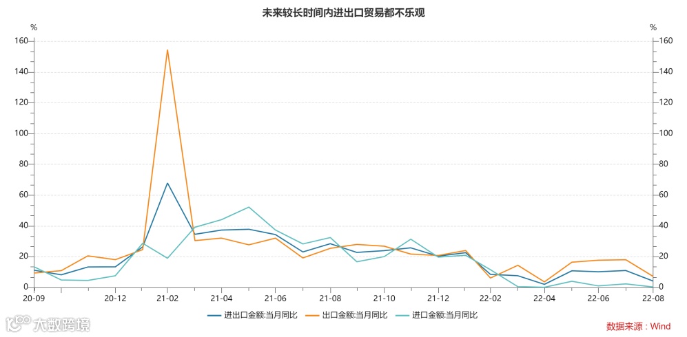 8月出口数据比较糟糕,同比增长仅7.1%,大幅低于前期18.0%,7月出口的靓丽表现只是昙花一现。出口增速放缓并不意外,但放缓程度让人担忧。这背后的最主要的逻辑是两个:一、过去八个季度出口总体表现较好的原因之一是全球疫情背景下,服务消费弱而商品消费强;二是欧美经济正在放缓,甚至大概率会进入衰退。全球疫情始终无法有效控制的背景下,无论政府是否有管制措施,居民生活轨迹一定是收缩的,线下服务消费减少,而对商品的需求可能增加的。以美国个人消费支出为例,在2020和2021两年商品支出年均复合增长8.1%,服务支出年均复合增长-1.4%。随着海外疫情影响度过高峰期,商品和服务的需求将会反向变化。海外经济放缓也会影响出口,美国制造业PMI在过去三个季度均值分别为60.2、57.8、54.8,7-8月进一步回落至52.8。尽管美国通胀有见顶迹象,但联储还是保持了鹰派态度,越来越多的人认为衰退不可避免,对中国商品的需求会随之下降。