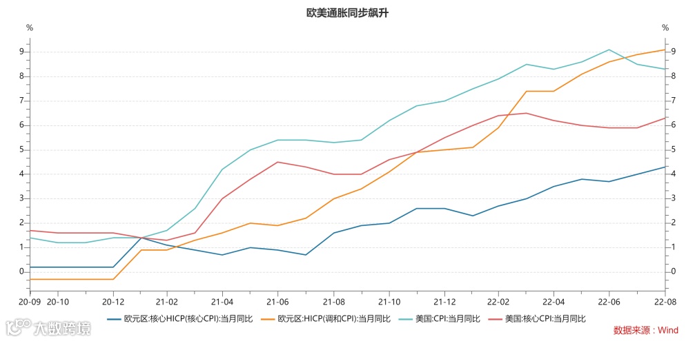 这次欧洲也需要重点关注了。9月8日,欧洲如期加息75个基点,为1999年以来最大幅度加息。欧洲央行行长拉加德称,未来将继续加息,算上本次加息,加息次数可能多于两次,不过75基点可能不会成为常态。此外,欧央行预计通胀还将继续上行一段时间。通胀压力来自于两个方向,能源和食品价格飙升,经济重新开放造成的某些行业的需求与供应错配。整个经济体的通胀压力继续走高并扩散,可能在短期内进一步上升。欧洲央行目前预计2022年平均通胀率为8.1%,2023年为5.5%,2024年降到2.3%。