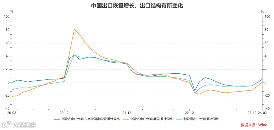 海关总署公布1-2月出口累计同比增长7.1%。去年基数较低是原因之一,如果全年能够保持这个增速,那么全年跟2023年相比将会明显恢复。前两个月出口增速最快的地区是对非洲、中国香港地区、印度、俄罗斯的出口,达到双位数,而对美、对欧出口同比分别为5.0%、-1.3%。对“一带一路”国家出口增长较快是亮点,这也是全球化格局剧烈变动后的自然选择。