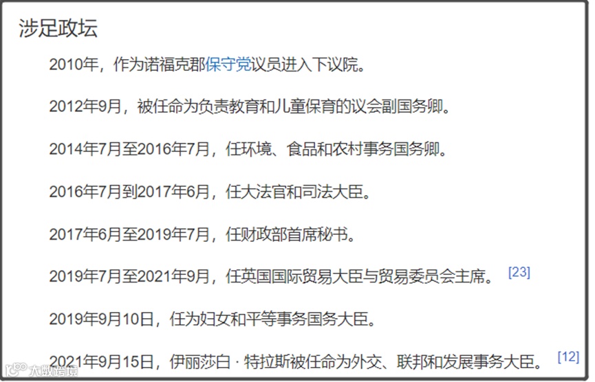 她是继撒切尔、特雷莎·梅后的英国第三位女首相。不过她当选的时机并不是太好,俄乌冲突、能源危机、新冠疫情以及严重的通货膨胀都是她需要面对的挑战。从履历上来看,特拉斯的从政经历非常丰富,横跨司法、经济、外交领域,可谓内外兼修。她的学业背景也令人羡慕,曾在牛津大学墨顿学院学习哲学,政治和经济学专业,还有10年大型企业的管理经验。以上种种,几乎没有人怀疑她在应对错综复发经济形势的能力。