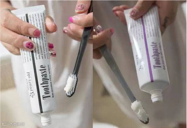 牙膏分为两款,自带洗牙功能的黑色牙膏和自带洁白坚固牙齿功效的紫色牙膏。