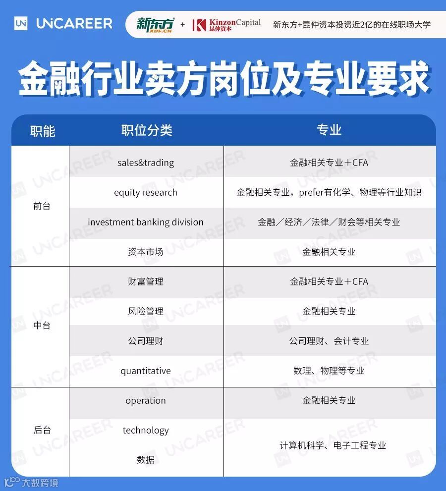 在投行,一般会分为前台、中台和后台。一般的岗位设置和专业要求是这样的: