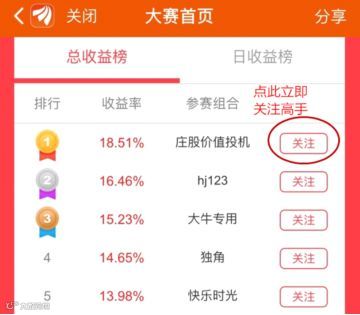 赛场如战场,你方唱罢我登场,每天总收益棒排行前三都有新鲜血液,跟着高手就能大幅提升你的排名,只需要在榜单上点击【关注】即可追踪各路英雄!