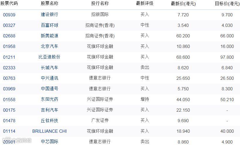 导读:最新港股机构评级