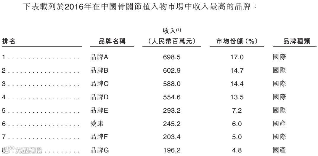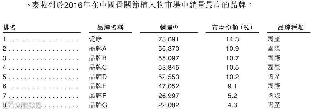 根据Frost & Sullivan,公司「爱康」品牌是中国最畅销的骨关节植入物品牌。2016年,就销量及收入而言,公司在中国骨关节市场的市场份额分别为14.3%及6.0%,收入份额较低源于公司在内的国产品牌产品平均出厂价低于国际品牌。