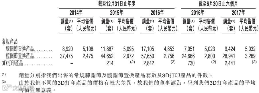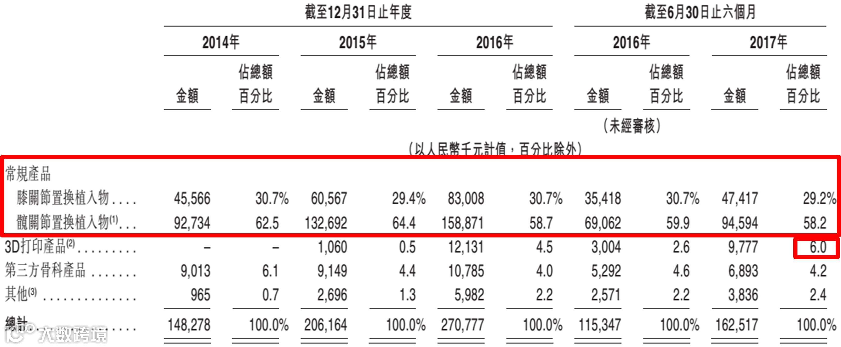 据IPO资料,公司是中国第一家且唯一一家将3D打印技术商业化且应用于骨关节及脊柱置换植入物的医疗器械公司。与常规产品相比,3D打印产品能够与天然关节的复杂性匹配,使骨头与假体达到更好的生物融合,尤其适合身体活动较多的患者,公司17年上半年3D打印产品收入占比已经上升到6%,14年来已交付超过6000件3D打印产品。