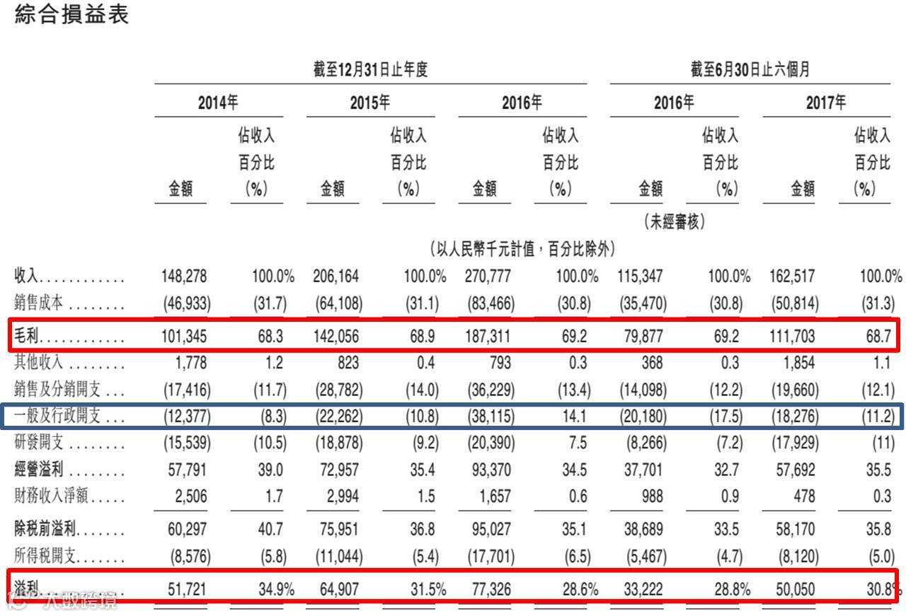 公司盈利水平最近都保持在高位,毛利率基本逼近70%,净利率在30%左右。行政费用由于上市开支等原因近年一直在上升。