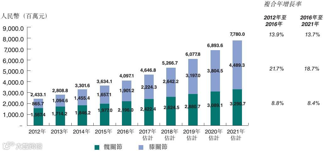 骨关节植入物市场主要包括髋关节及膝关节置换植入物两部分。中国骨关节植入物市场由2012年约人民币24亿元增长至2016年的人民币41亿元,复合年增长率为13.9%,预计将于2021年进一步增长至人民币78亿元,2016年至2021年期间的复合年增长率为13.7%。
