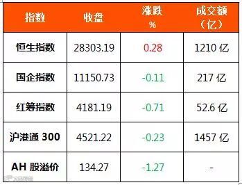 恒生指数涨0.28%,报28303.19点;国企指数跌0.11%,报11150.73点;红筹指数跌0.71%,报4181.19点。大市成交1209.75亿港元。恒安国际涨3.61%,报77.5元,领涨蓝筹。科网股上涨。腾讯控股涨3.28%,报378元;瑞声科技涨2.95%,报143元;舜宇光学涨2.48%,报111.7元。濠赌股上涨。新濠国际发展涨5.25%,报21.05元;美高梅中国涨4.05%,报21.85元;银河娱乐涨3.03%,报56.15元。内房股下跌。中国恒大跌2.96%,报24.55元,盘中一度跌近10%;融创中国跌1.98%,报32.25元;碧桂园跌1.92%,报12.28元。